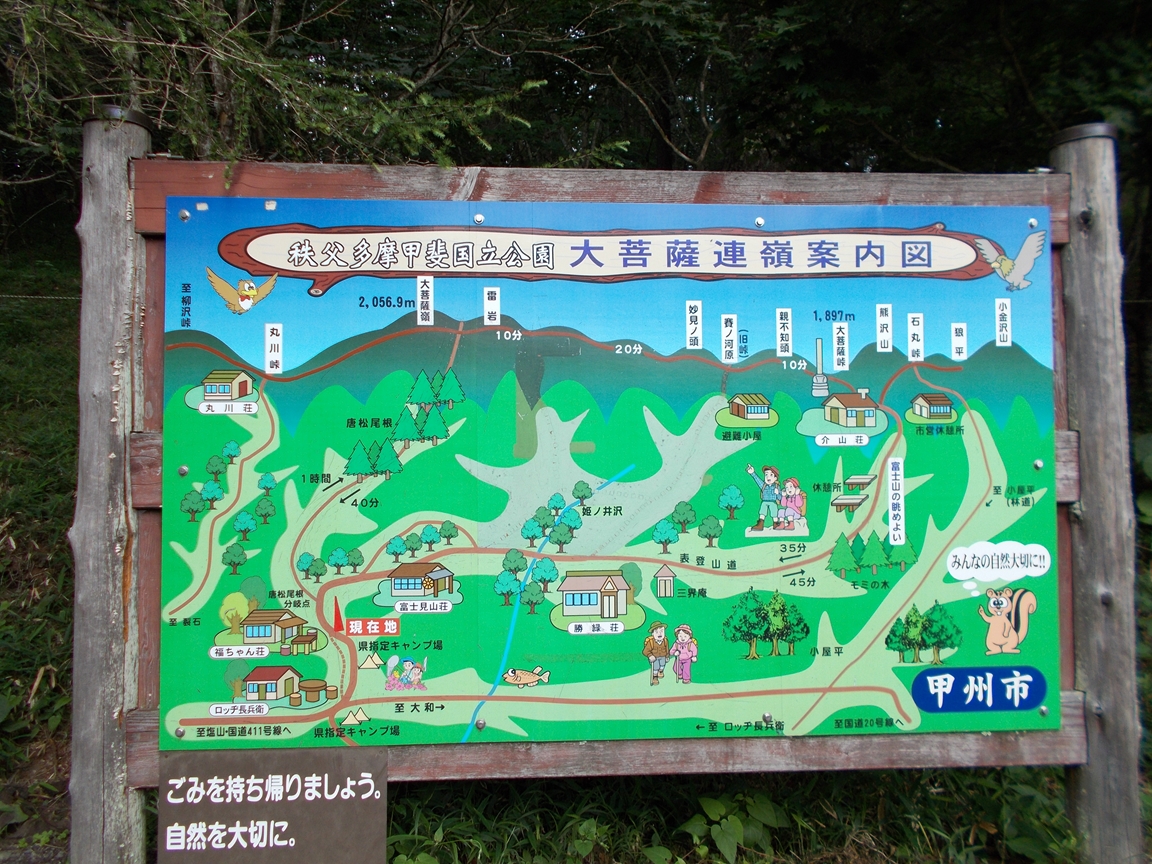 介山荘の前に大菩薩峠の山頂記念碑が立っており、多くの人が、写真の取り合いっこしていました。その中の一人が「かいさんそう」「介、山荘」と読んでいたのにやや驚きましたが、これは実際、中里介山の名を取って「介山荘」としたのではなくて、「介、山荘」が正しいのかもしれないと考えたりもしました。